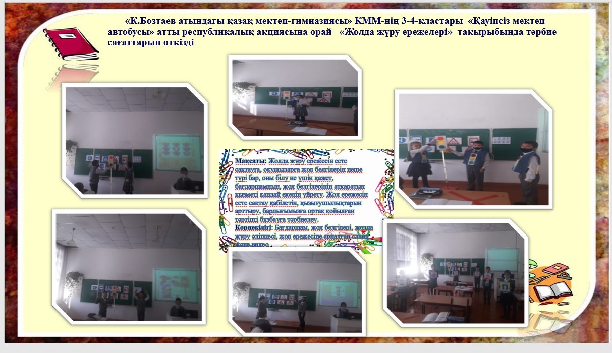 «К.Бозтаев атындағы қазақ мектеп-гимназиясы» КММ-нің 3-4-кластары «Қауіпсіз мектеп автобусы» атты республикалық акциясына орай «Жолда жүру ережелері» тақырыбында тәрбие сағаттарын өткізді